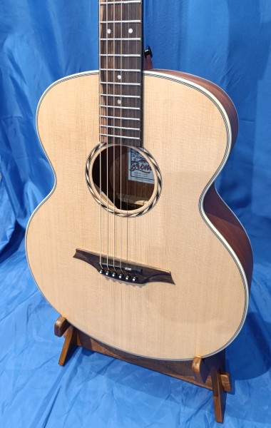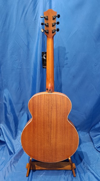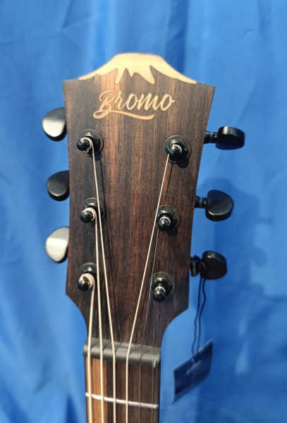 Bromo BAA8S is a mini-jumbo acoustic guitar designed to offer a good balance between playing comfort and projection. Its solid spruce top provides clarity and dynamics, while the laminated mahogany back and sides contribute to a warm, balanced tone. Its short 597 mm scale length and 43 mm nut width make it easy to handle, making the instrument particularly suitable as a travel guitar.