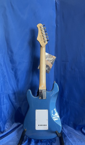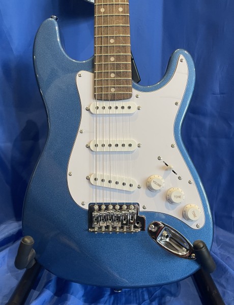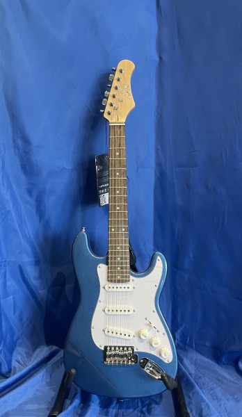Eko ST100 3/4 Metallic Blue est une guitare électrique au format réduit, idéale pour les jeunes guitaristes ou les petites mains. Son corps en peuplier et son manche en érable vissé au profil low C offrent une prise en main confortable et immédiate, avec un diapason court adapté à l’apprentissage.